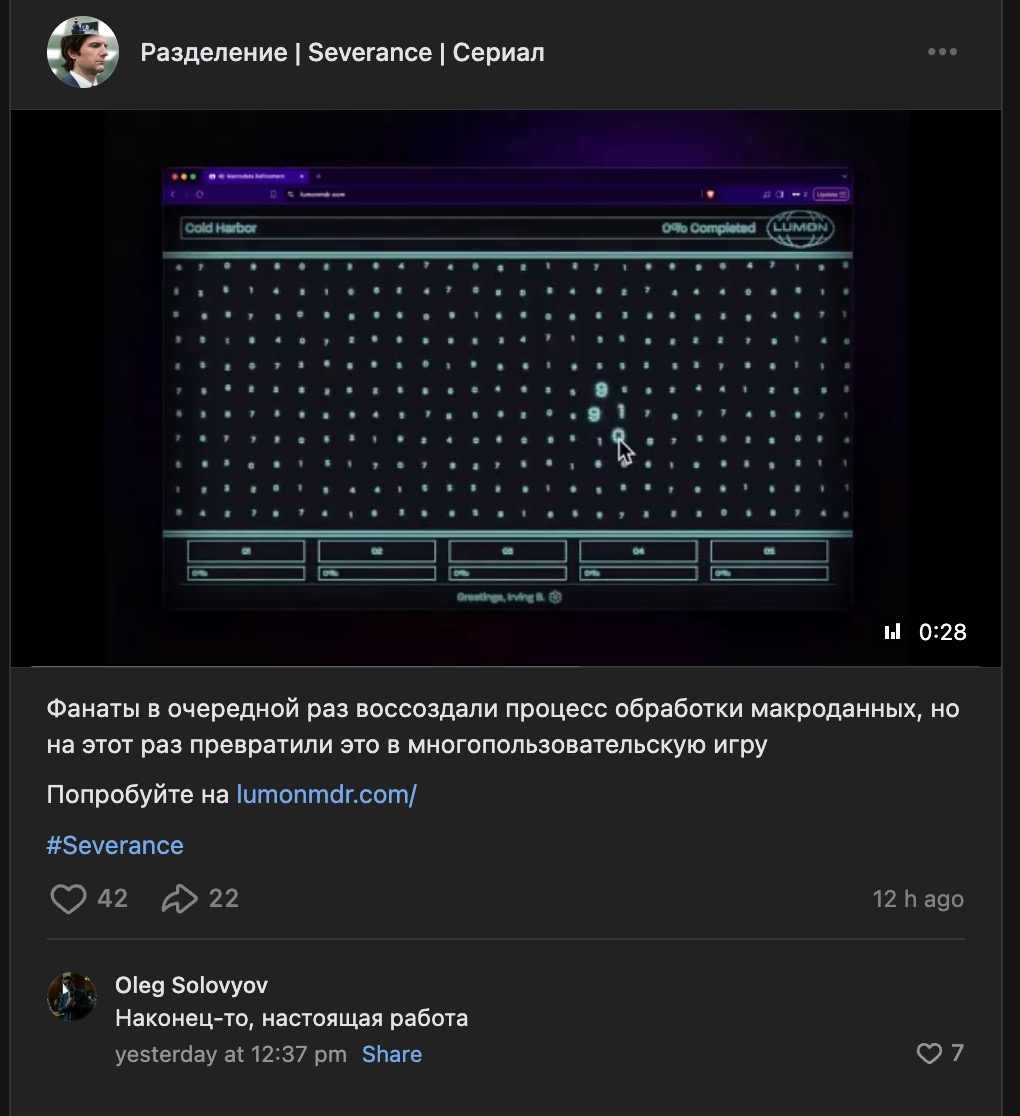 I would occasionally go back to Waterloo to visit friends and work on some things. A big thing was Matia and I's severance fan project — we recreated the macro-data-refinement in the show as a collaborative web game. It offered some cool challenges to make: player state management over sockets, virtualization of the grid, and more. The project went semi-viral on Russian facebook and got some cool users. We will put it back up when season 3 airs